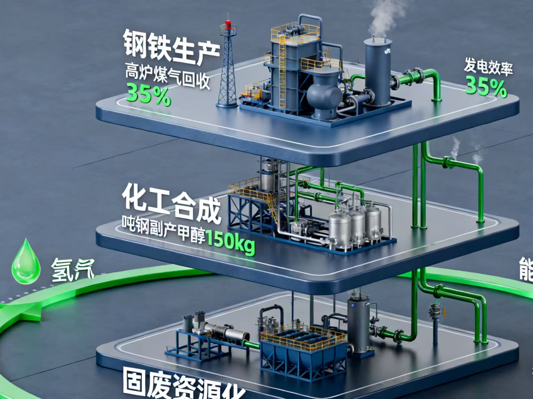 钢化联产技术开创了工业循环新模式。通过"钢-焦-化-氢"一体化系统,将钢厂尾气转化为化工原料,生产乙二醇和LNG产品。这项技术突破实现了载碳能源的梯级利用,使碳排放强度降低30%以上。